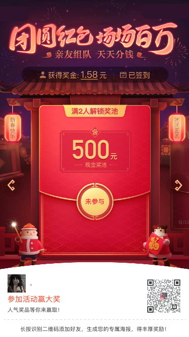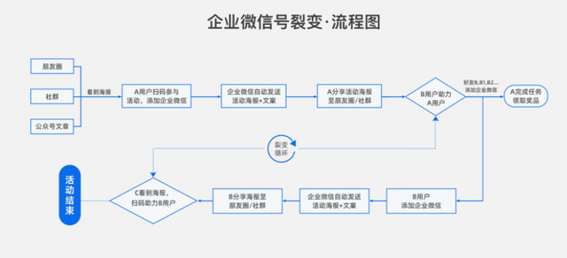 1.企业微信裂变原理:用户通过添加企业微信号获取专属海报,邀请好 友扫码添加企业微信好友为自己助力,助力值达到指定邀请目标人数后,即可领取商家奖品;好友如果对活动奖励感兴趣,则会继续分享转发海报,形成裂变循环,实现企业微信号指数级增长。